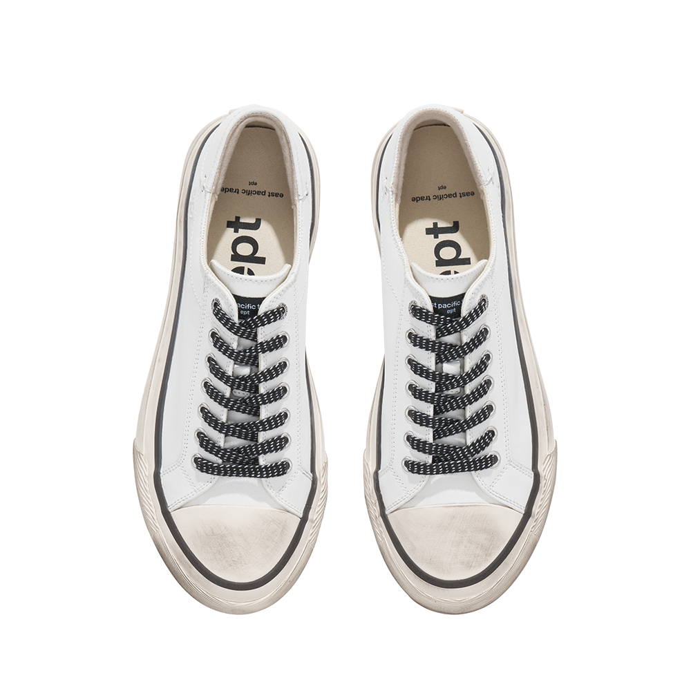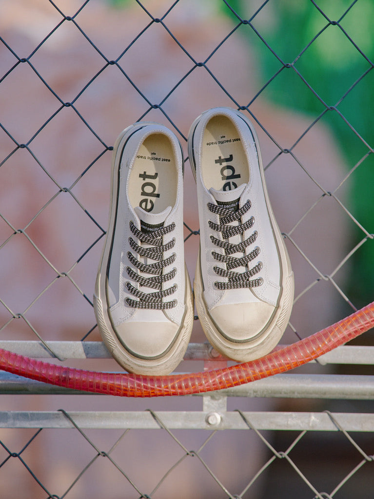 The DIVE VNTG LE in off white reimagines East Pacific Trade’s signature silhouette in a distressed canvas upper and burnished outsole finish. This reinterpretation keeps the essence of the original DIVE but adds character through layered textures and subtle vintage appeal.