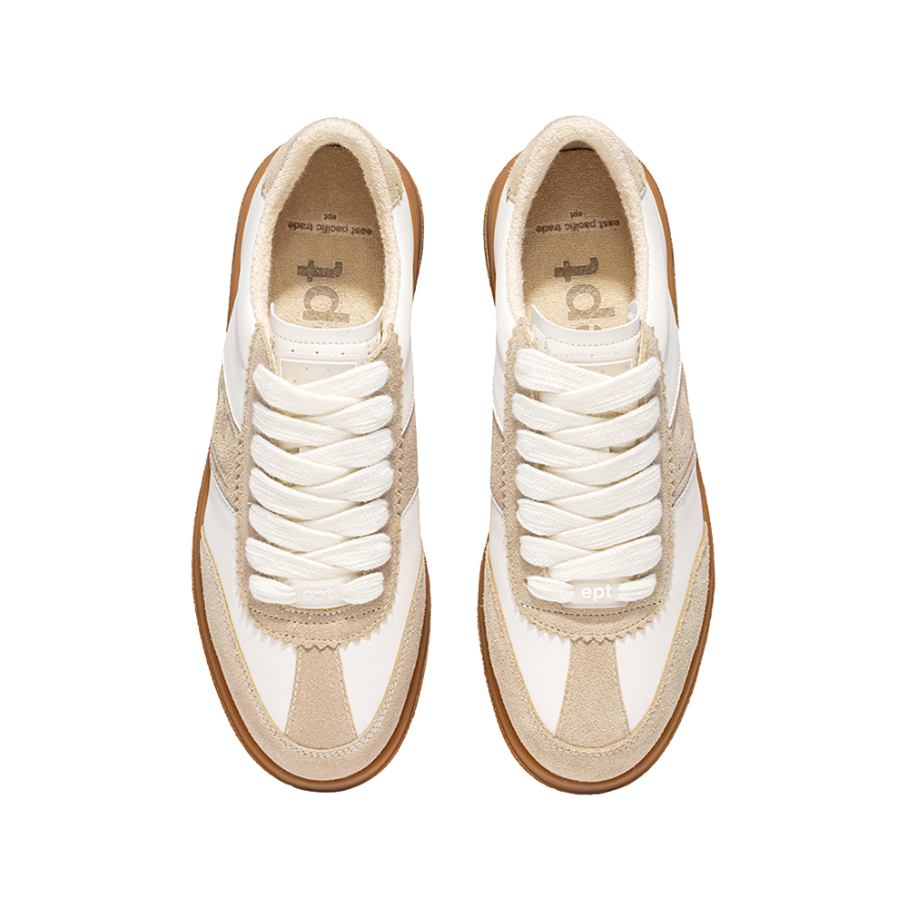 The SANTOS trainer in beige with white accents is a timeless low-profile sneaker. Its vintage silhouette and premium suede finish make it a versatile pick for everyday wear. Pair it with jeans, chinos, or casual outfits for effortless style that never feels overdone.